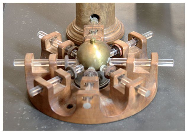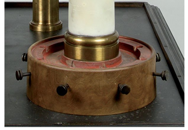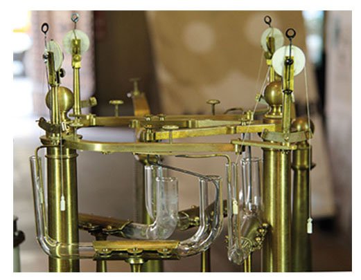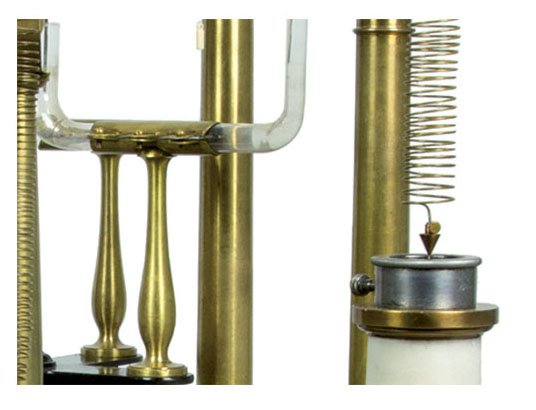 Le due punte metalliche costituiscono i contatti elettrici di un circuito che comprende, oltre a una pila, anche il registratore. Sulla superficie libera del mercurio del tubo più stretto poggia un galleggiante di osso, collegato con un filo di seta a una puleggia di osso e a un contrappeso dalla parte opposta. Alla puleggia è solidale un indice per la misura dell’ampiezza dell’oscillazione del mercurio. Tale misura si effettua per mezzo di una scala graduata fissata alla colonnetta di ottone che sostiene la puleggia.