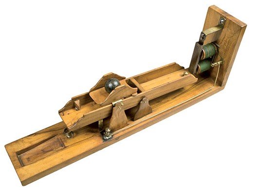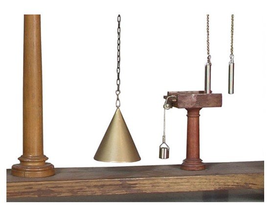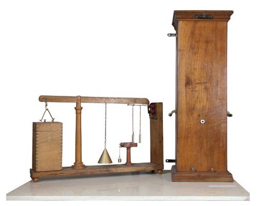 All’estremo del braccio minore è collegata una pila, mentre l’estremità del braccio lungo termina con una piastrina di ferro, bloccata dall’àncora di una elettrocalamita fissata a un’asse di legno solidale alla base del dispositivo. Il braccio lungo sostiene inoltre un peso conico e due pesetti appesi a due catenelle. Di questi ultimi uno è sospeso nel vuoto e libero di scorrere lungo la piccola barra cilindrica di sostegno, mentre l’altro poggia sopra un’assicella di legno sottostante, scorrevole orizzontalmente per mezzo di un altro pesetto.