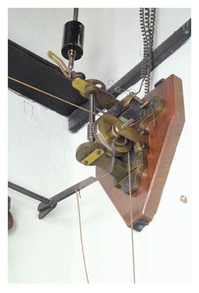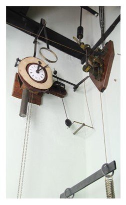 All’occorrenza di un moto sufficiente ad attivare il pendolo avvisatore, si chiude il circuito elettrico su di un’elettrocalamita che libera sia il meccanismo di discesa del parallelepipedo delle carte affumicate sia l'orologio, che si avvia e una suoneria entra in funzione.