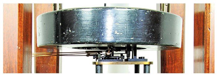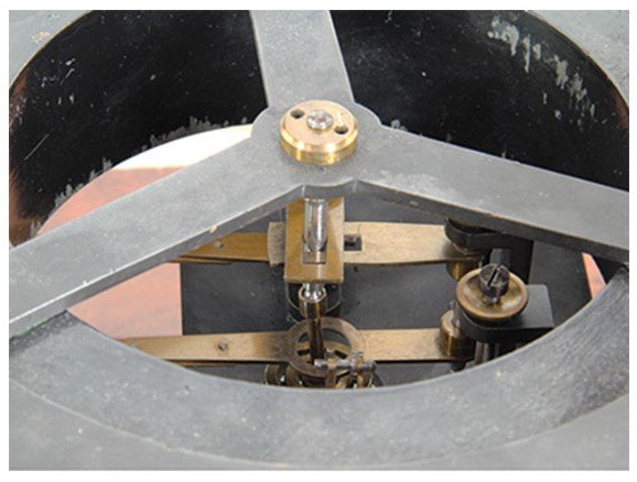 Sopra la base del telaio di legno è avvitato un secondo telaio di ferro che regge un tavolino con i sistemi di trasmissione e di registrazione del moto, oltre all’orologio per la determinazione dell’orario di inizio della registrazione della scossa e a una bobina per l’attivazione dello strumento.