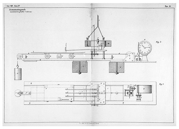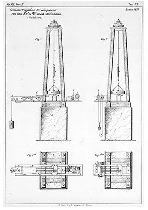 Per mezzo del perno di acciaio, la massa trasmette il moto relativo del terreno a un sistema di staffe e di leve, che lo scompongono nelle tre componenti, due orizzontali perpendicolari tra loro e una verticale. Le leve fanno capo ad altrettanti pennini di legno, lunghi 10 centimetri, recanti all’estremità tre aghi verticali; questi, muovendosi, segnano tre tracce sul vetro affumicato che scorre sotto di loro, trascinato dal carrello.