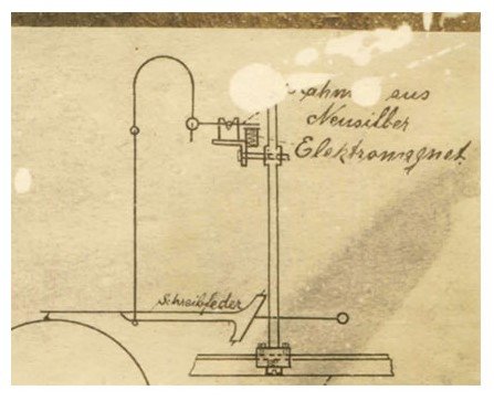 Ogni braccio comanda, dopo un opportuno smorzamento, il corrispondente pennino scrivente, realizzato da una leggera struttura di filo di alluminio che termina con un sottile pennino, anch’esso di alluminio. All’estremità anteriore di ogni braccetto scrivente è montato uno stilo sulla cui punta è alloggiato un sottile filo di platino che scrive su una striscia di carta affumicata, chiusa ad anello. Quest’ultima è trascinata a velocità costante da rulli solidali messi in rotazione da un sistema a orologeria, azionato mediante un peso.